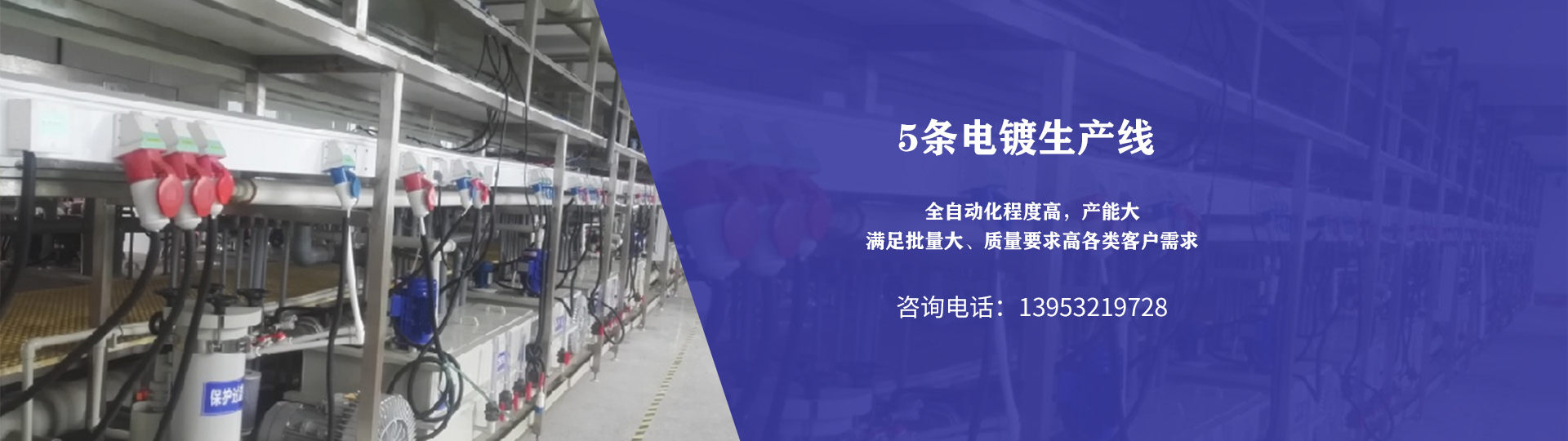 共有5條電鍍生產(chǎn)線,專門從事金屬表面電鍍處理,全自動(dòng)化程度高,產(chǎn)能大
